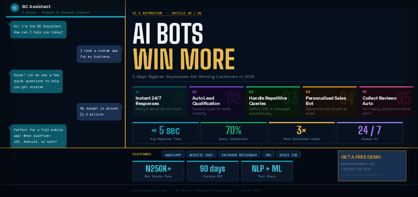 At Blessed Creation, our AI bot solutions start from ₦250,000 for a basic WhatsApp FAQ bot up to ₦2M+ for a fully intelligent, multi-platform conversational agent with CRM integration, lead scoring, and analytics. The ROI for most businesses is visible within the first 90 days.